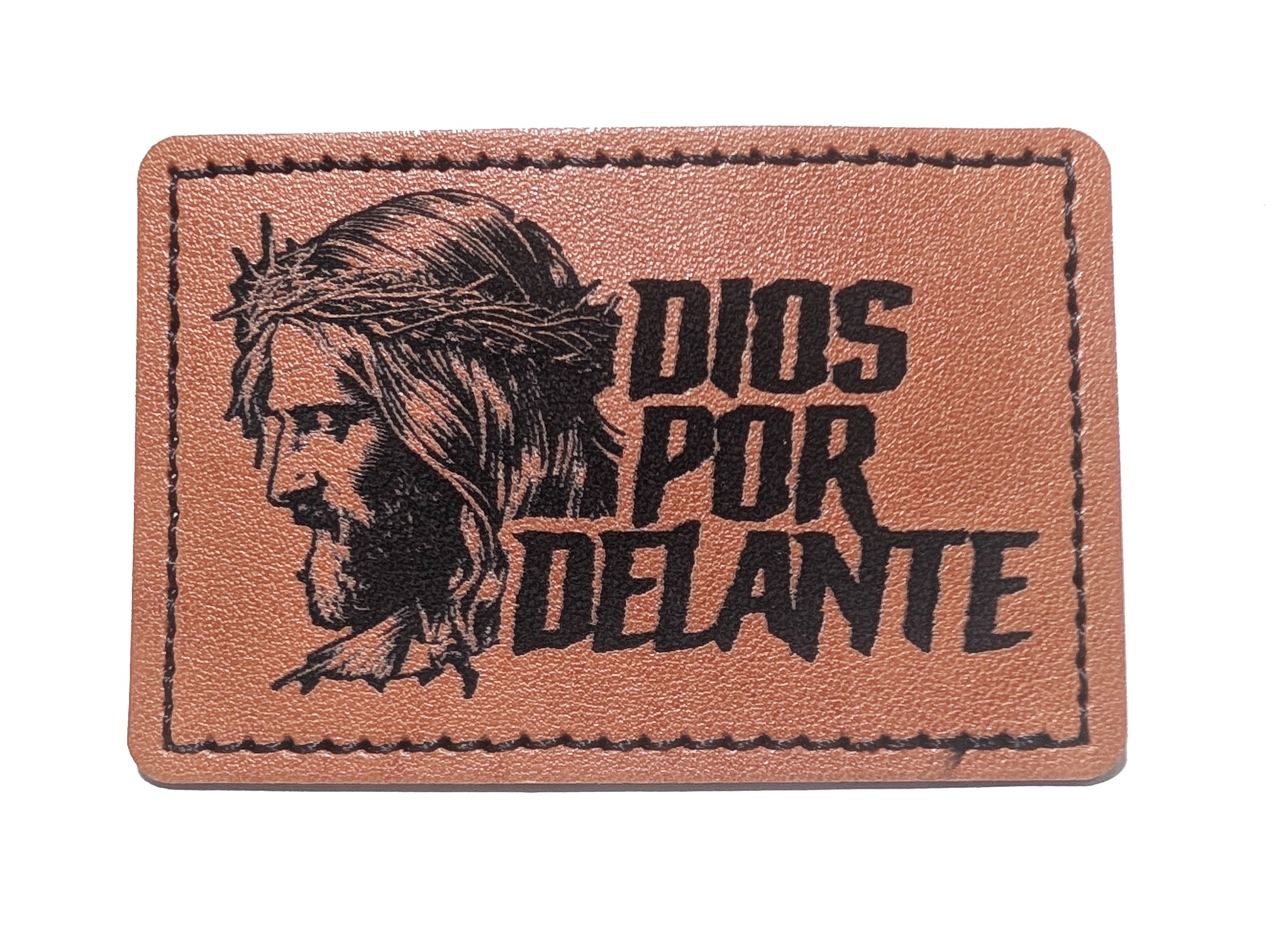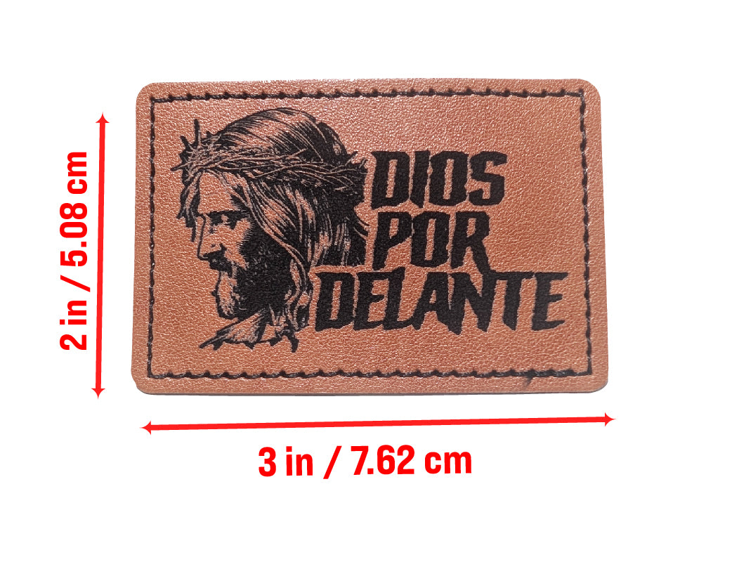 Dios por delante Faux Leather Patch – 3x2" Brown Leather Iron-On for Jackets, Vests #2