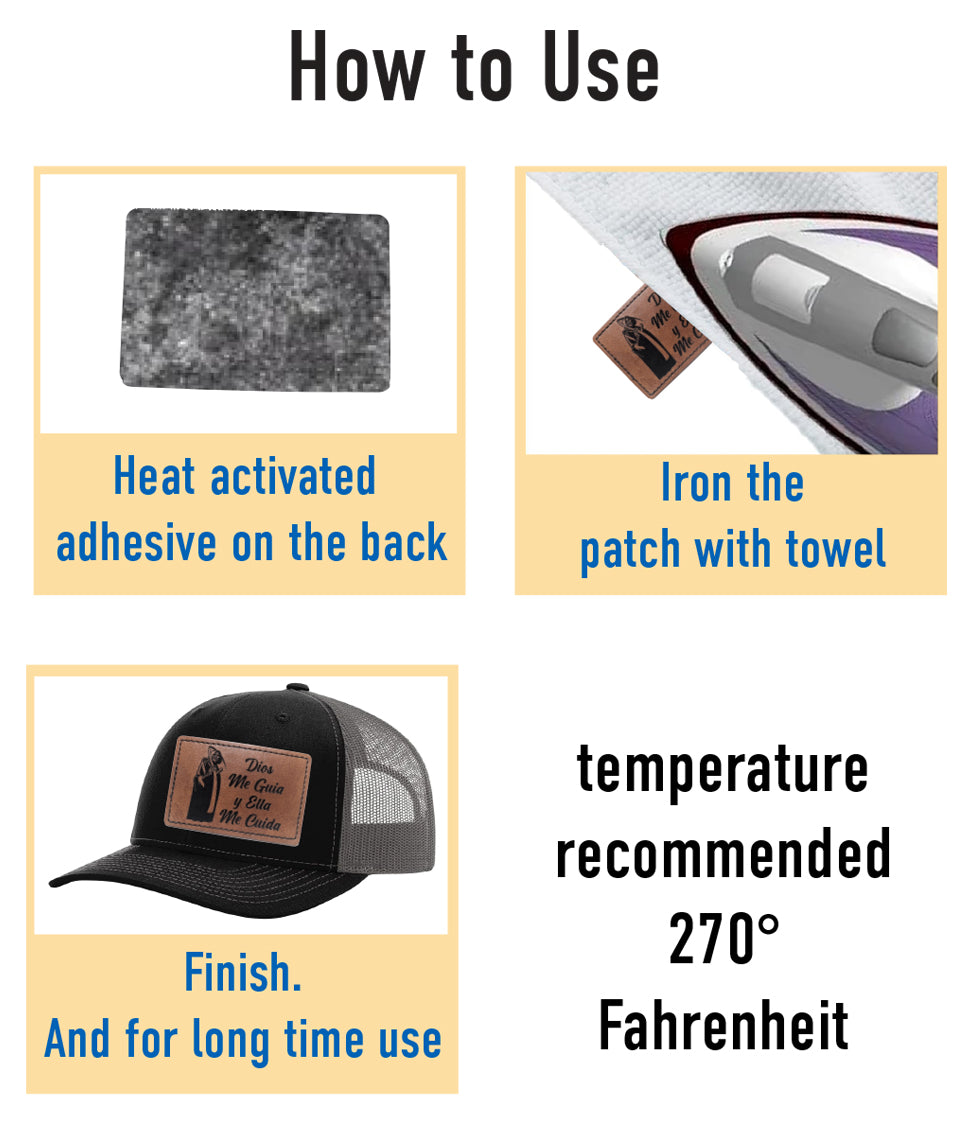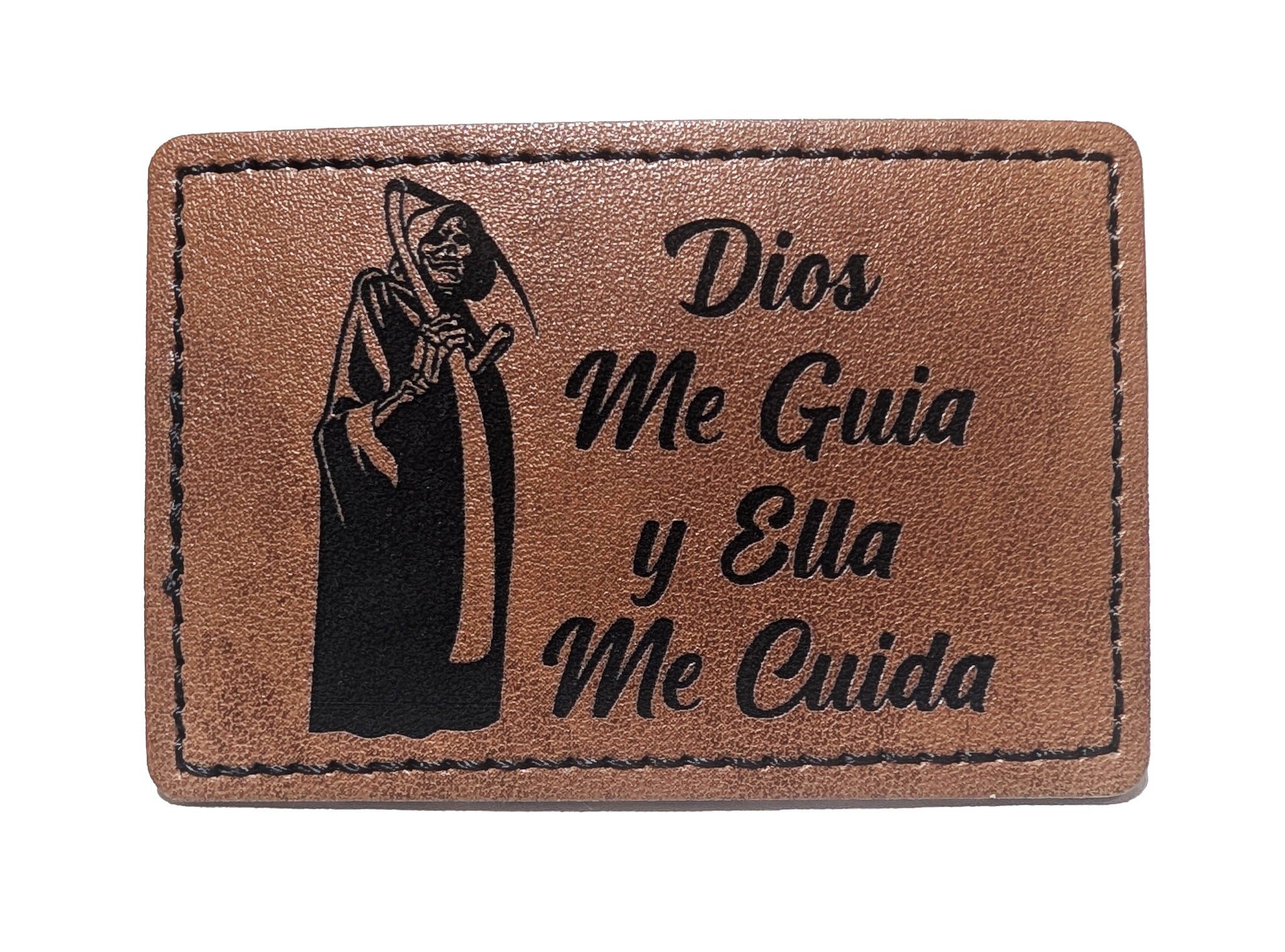 Santa Muerte Dios me Guia y Ella me Cuida Faux Leather Patch – 3x2" Brown Leather Iron-On for Jackets, Vests